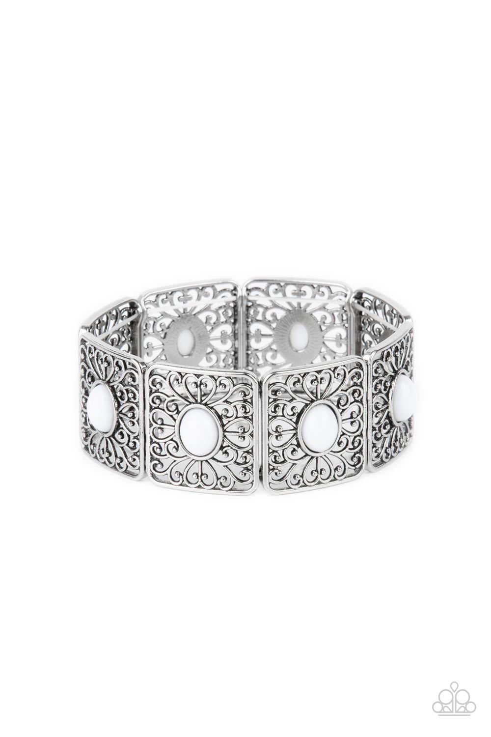 A white oval bead is pressed into the center of an airy square frame featuring whimsical heart-shaped and vine-like filigree. The patterned frames are threaded along stretchy bands to repeat around the wrist creating a charismatic ambiance.
