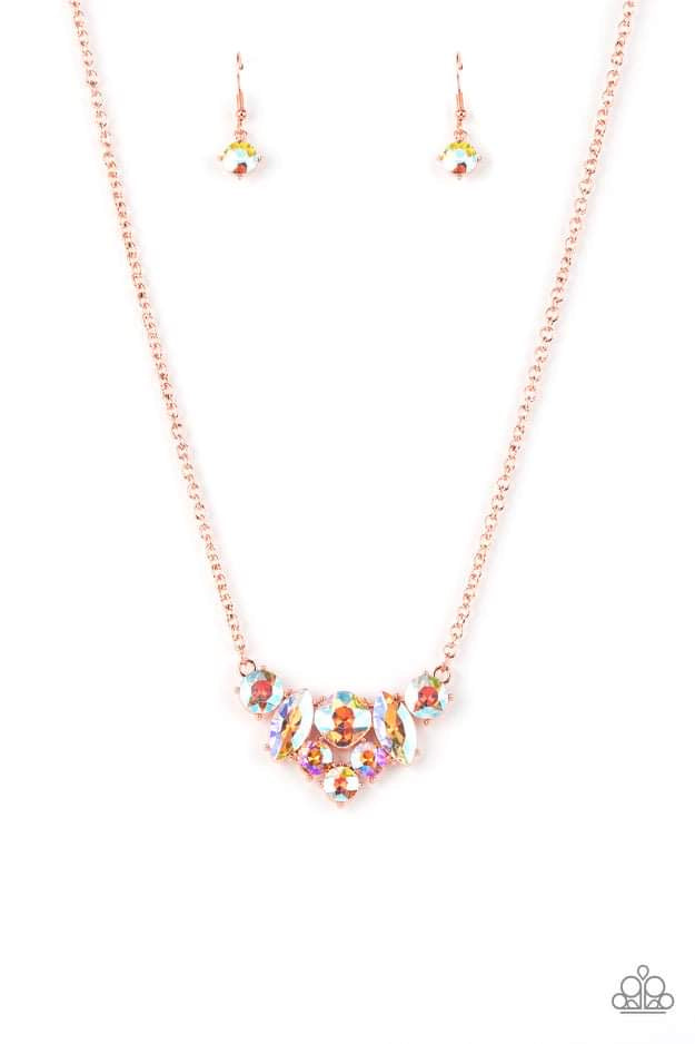 A glittering collection of marquise and round peach-colored gems encased in studded copper fittings, coalesce into a lavish frame that gives way to a classic shiny copper chain resulting in a glamorous finish below the collar. Features an adjustable clasp closure.