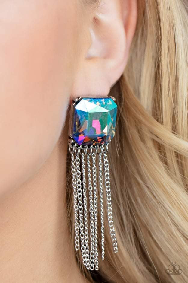 Featuring a stellar UV shimmer, an oversized radiant cut gem is pressed into a pronged silver fitting that gives way to a tapered curtain of silver chains for an out-of-this-world finish. Earring attaches to a standard post fitting.