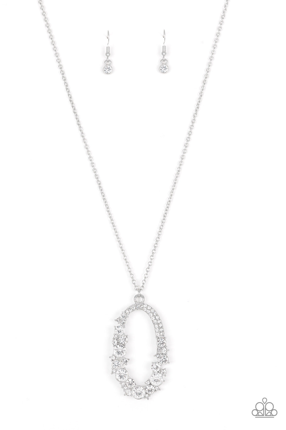 Varying in size, an array of glittery white rhinestones are encrusted along a shimmery silver hoop. The sparkling pendant swings from the bottom of an elongated silver chain for a glamorous finish. Features an adjustable clasp closure.