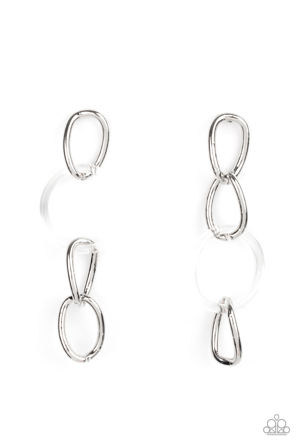 Shiny silver oversized links, interrupted by a single large clear acrylic ring, fall from the ear in linked succession for an on-trend fashion statement. Earring attaches to a standard post fitting.