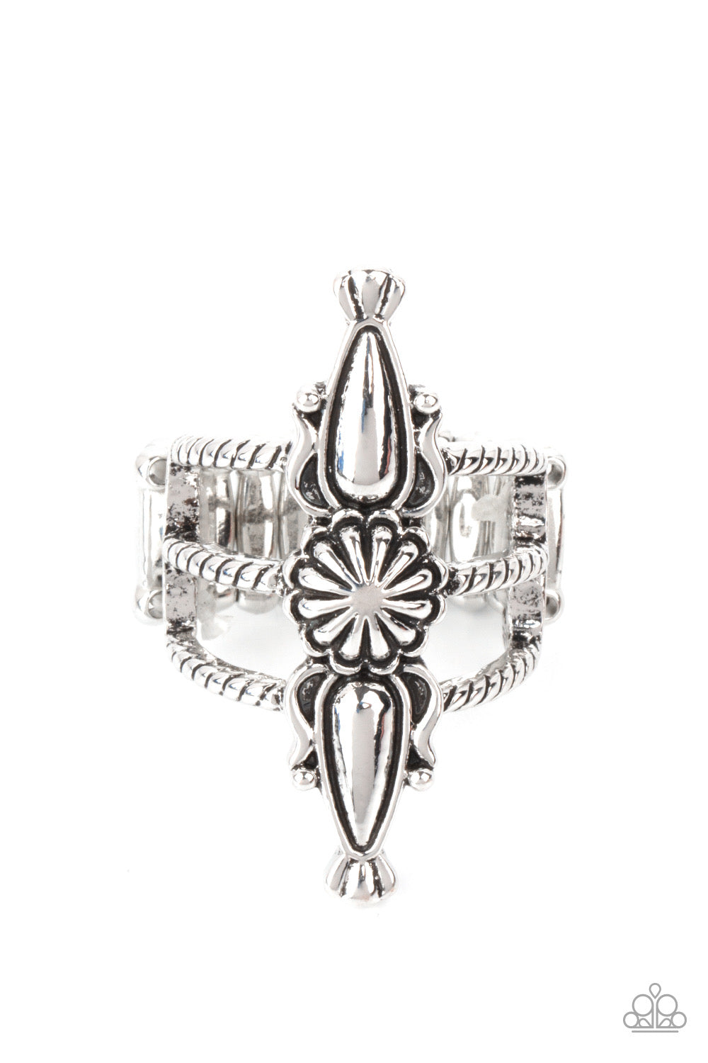 An antiqued silver flower frame is flanked by two decorative silver teardrop frames, creating a rustic centerpiece atop three textured silver bands. Features a stretchy band for a flexible fit.